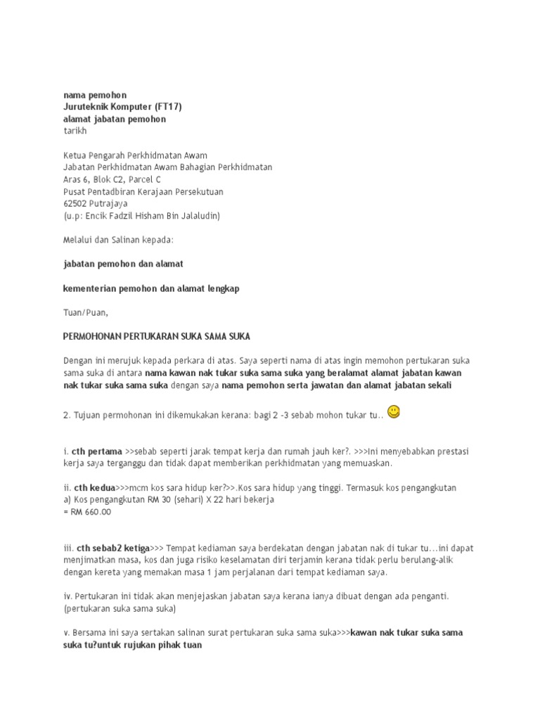 Kepada mereka yang ingin membuat rayuan egtukar di KPMJPN ataupun di PPD bolehlah merujuk contoh surat Permohonan Rayuan Pertukaran di bawah. Info dan panduan tukar nama geran voc kenderaan. 15 contoh surat rasmi pertukaran alamat syarikat kumpulan contoh surat.